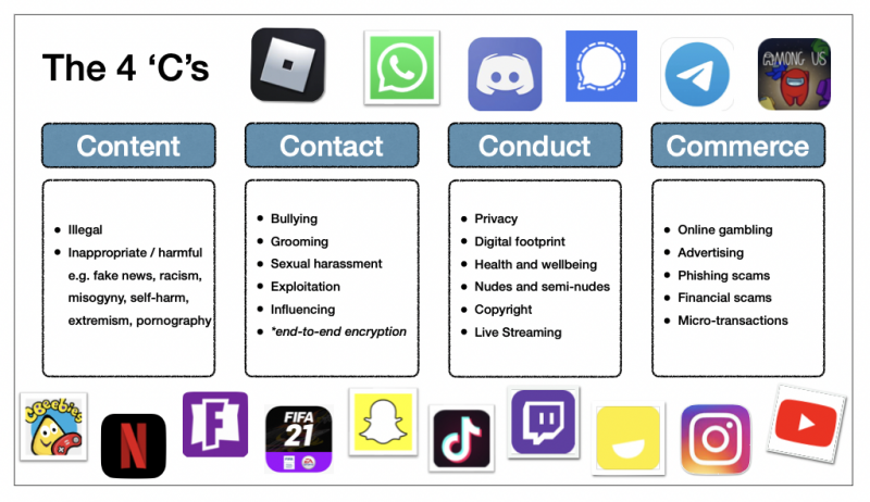 - Content – being exposed to illegal, inappropriate, or harmful content, such as pornography, fake news, racism, misogyny, self-harm, suicide, antisemitism, radicalisation and extremism.