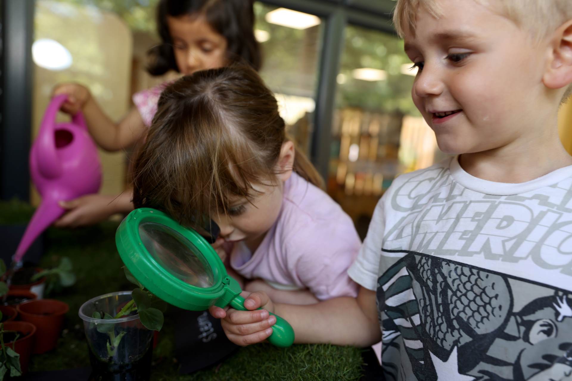 Adults model curiosity and respect for living things, supporting children to handle creatures gently and care for plants they grow. Children learn about growth, change and decay, helping them develop early scientific understanding and responsibility for the environment.